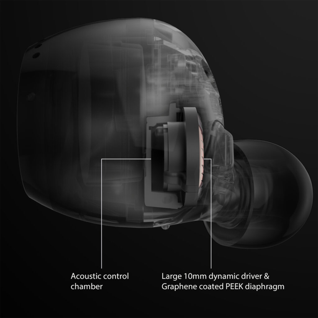 ▲ 採用 10mm 石墨烯塗層 PEEK 震膜動圈單元,輔以聲學控制腔體。
